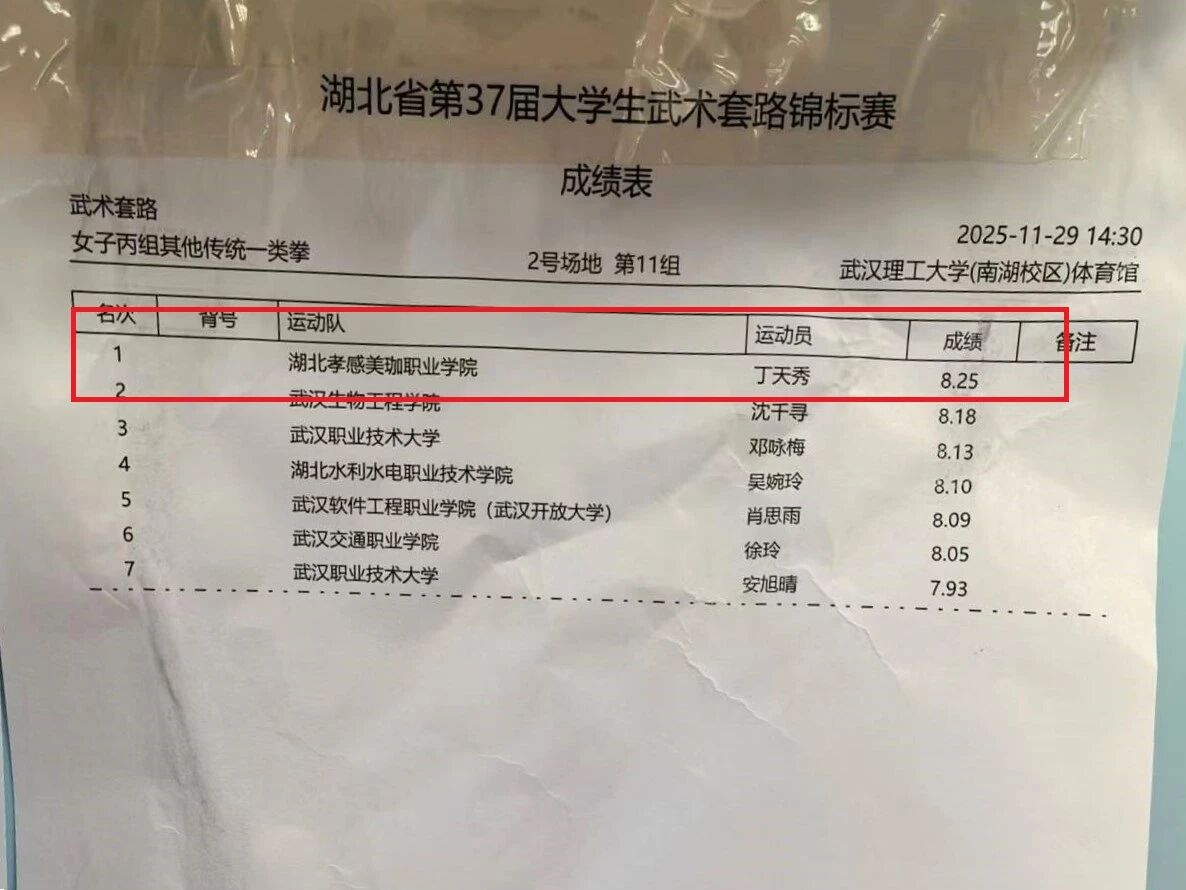 以武强体,以文化人。美珈职院在本届省大学生武术套路锦标赛上的优异表现,是学校坚持特色办学、深化素质教育取得的丰硕成果。它有力证明了,将中华优秀传统文化融入现代职业教育,能够有效激发学生潜能,培养出既具专业技能,又富人文素养、身心健康的时代新人。展望未来,学校将继续在名誉校长萧永瑞女士办学理念的指引下,扎根传统文化沃土,让更多学子在国粹的熏陶中强健体魄、锤炼意志、传承文脉,绽放更加绚丽的青春光华!